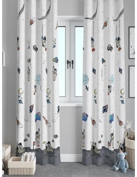 Завеса за детска стая с весел космически дизайн. Илюстрации на астронавти, ракети, планети и балони, които вдъхновяват мечти за космоса. Изработена от полиестерна материя, която осигурява леко затъмняване и уют. Нежни сиви, бели и сини тонове, които се съчетават хармонично с останалите елементи.