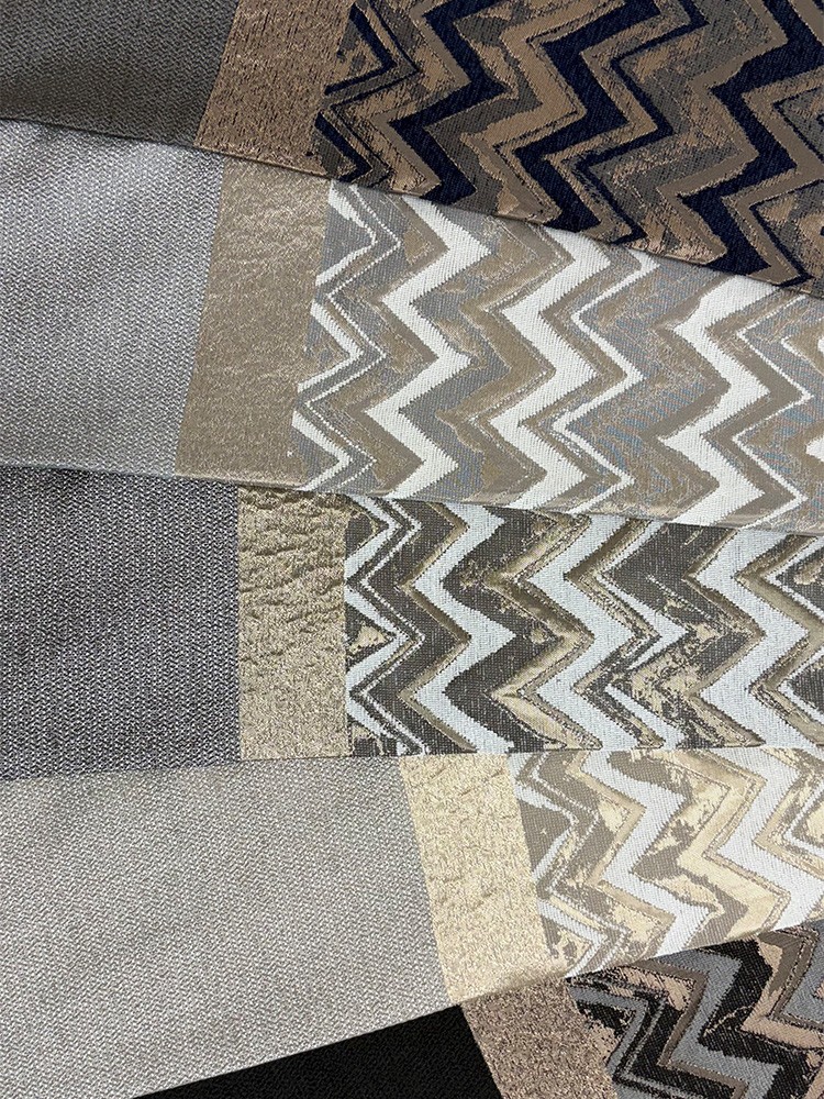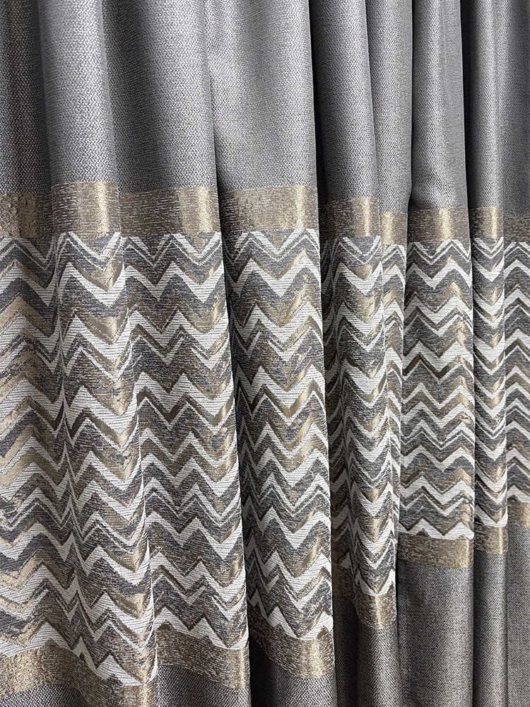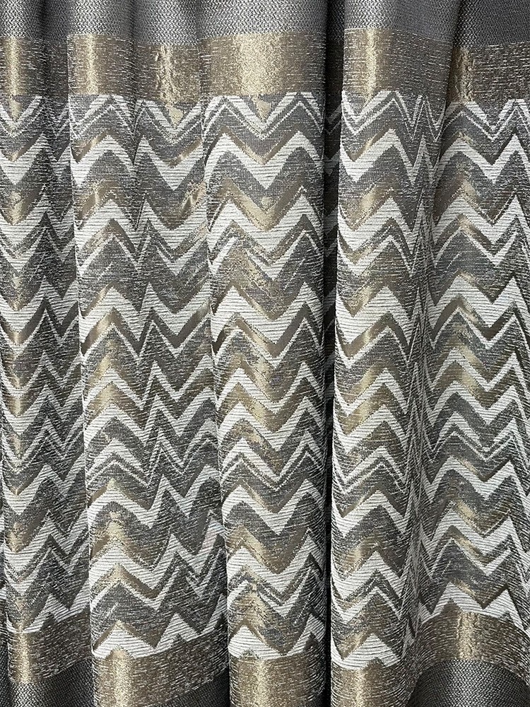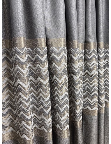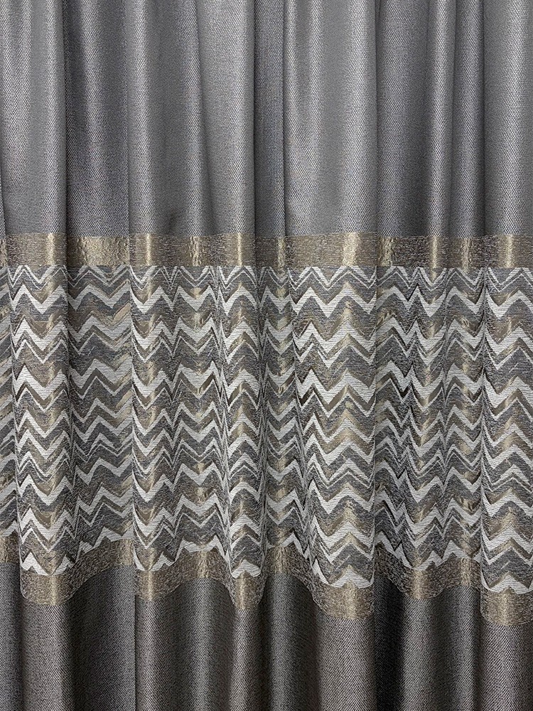 Пано завеса със стилен зиг-заг мотив, която съчетава модерната геометрия с нежен металически отблясък в златисто и сребристо. Сивата основа придава дълбочина и баланс, а десенът добавя движение и характер. Материята е плътна, приятна на допир и стои красиво във всеки интериор. Подходяща е за прозорци и витрини, където желаете елегантен, но динамичен акцент. Височина на текстила 290см.