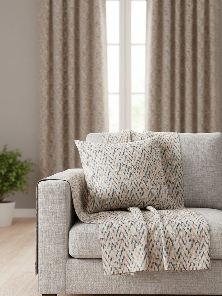 Този стилен текстил комбинира - 40% памук и 60% полиестер, съчетавайки естествена мекота и устойчивост в едно. Шарката е артистично разчупена – смесица от нежно оранжево, меко синьо и базова слонова кост, напомняща абстрактни вълни или фина мазилка. Материята пада елегантно и внася визуална дълбочина, без да натоварва интериора. Идеален избор за модерни, светли и уютни пространства, в които търсиш акцент с характер, но в нежни тонове. Състав - 60% полиестер; 40% памук. Височина на текстила - 280см.