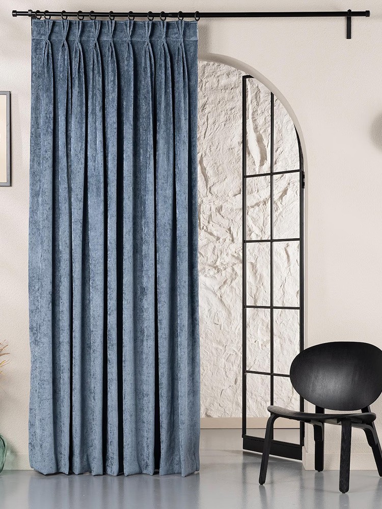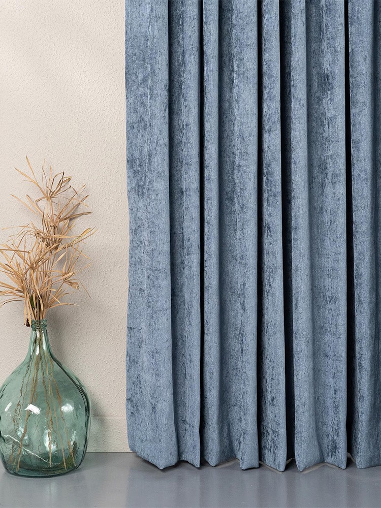 Луксозна плътна завеса с мека плюшена текстура в елегантен пастелен син цвят. Материята е приятна на допир и има фин блясък, който придава дълбочина и стил на интериора. Благодарение на леко меланжирания ефект, платът променя нюансите си според светлината и създава усещане за динамика и изисканост.