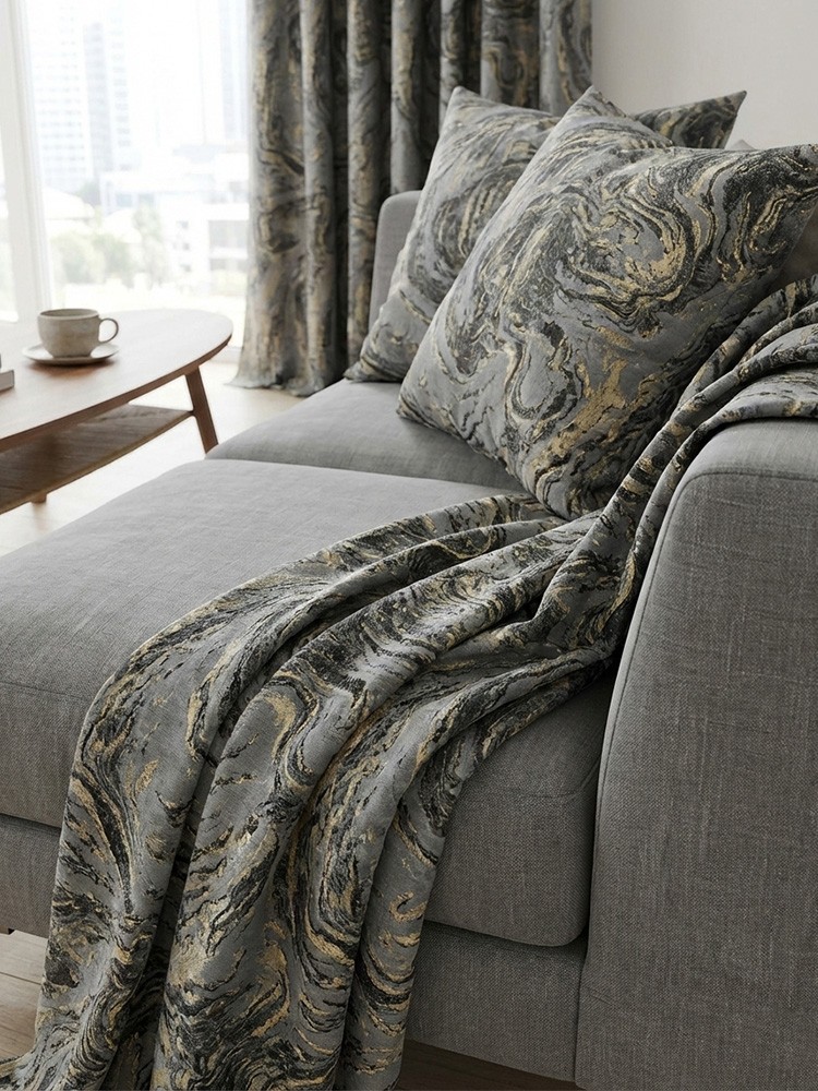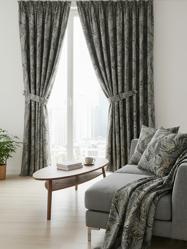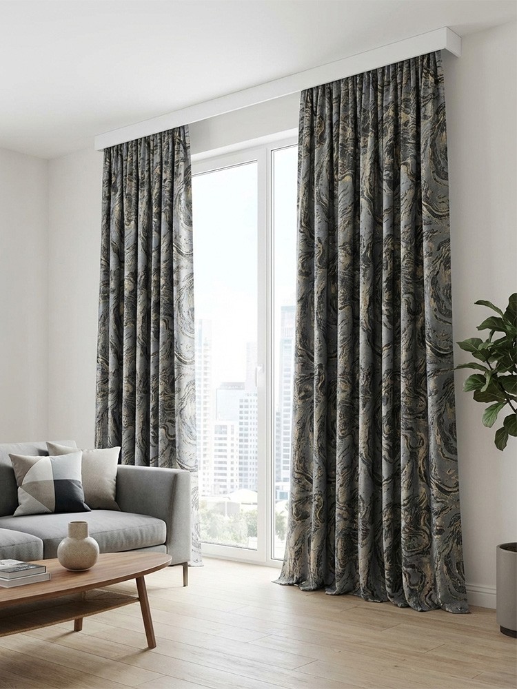 Тази завеса впечатлява с изразителна вълнообразна шарка, която напомня естествени движения и придава дълбочина на интериора. Тъмносиният цвят, комбиниран с фини нишки в капучино-златист цвят и лек дискретен блясък, създава усещане за елегантност и съвременен лукс. Платът пада меко и плътно, оформя красиви гънки и придава завършен вид на пространството. Подходяща е за модерни дневни, спални или пространства с изчистен, стилен характер. Максимална височина на текстила - 290см. Състав - 100% полиестер.