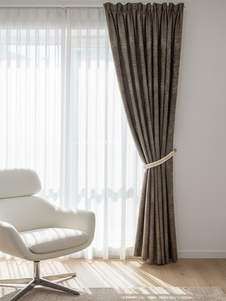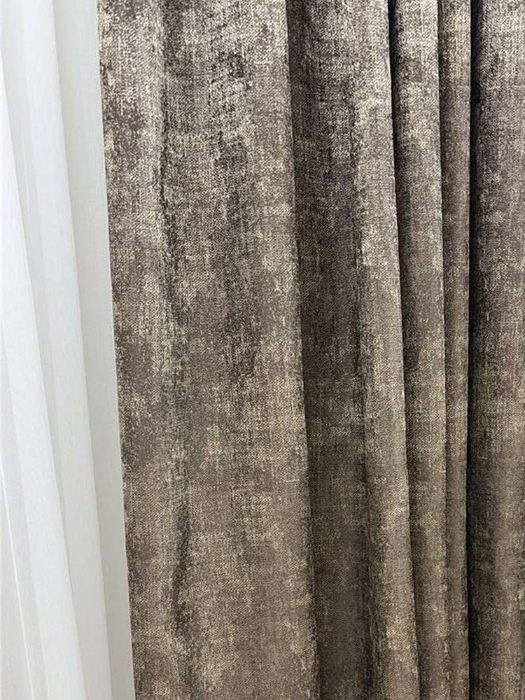 Тази завеса впечатлява с топъл кафяв цвят и елегантна меланжирана шарка в по-светли нюанси, която създава дълбочина и уют в интериора. Материята е мека, пада тежко и красиво, като оформя богати гънки и придава завършен вид на помещението. Подходяща е както за модерни, така и за по-класически пространства. Фината меланжирана шарка в по-светли тонове придава дълбочина и луксозно излъчване, без да натоварва интериора. Осигурява затъмняване до 60%, което я прави подходяща както за дневни помещения, така и за спални. Състав - 100% полиестер. Максимална височина на текстила - 280см.