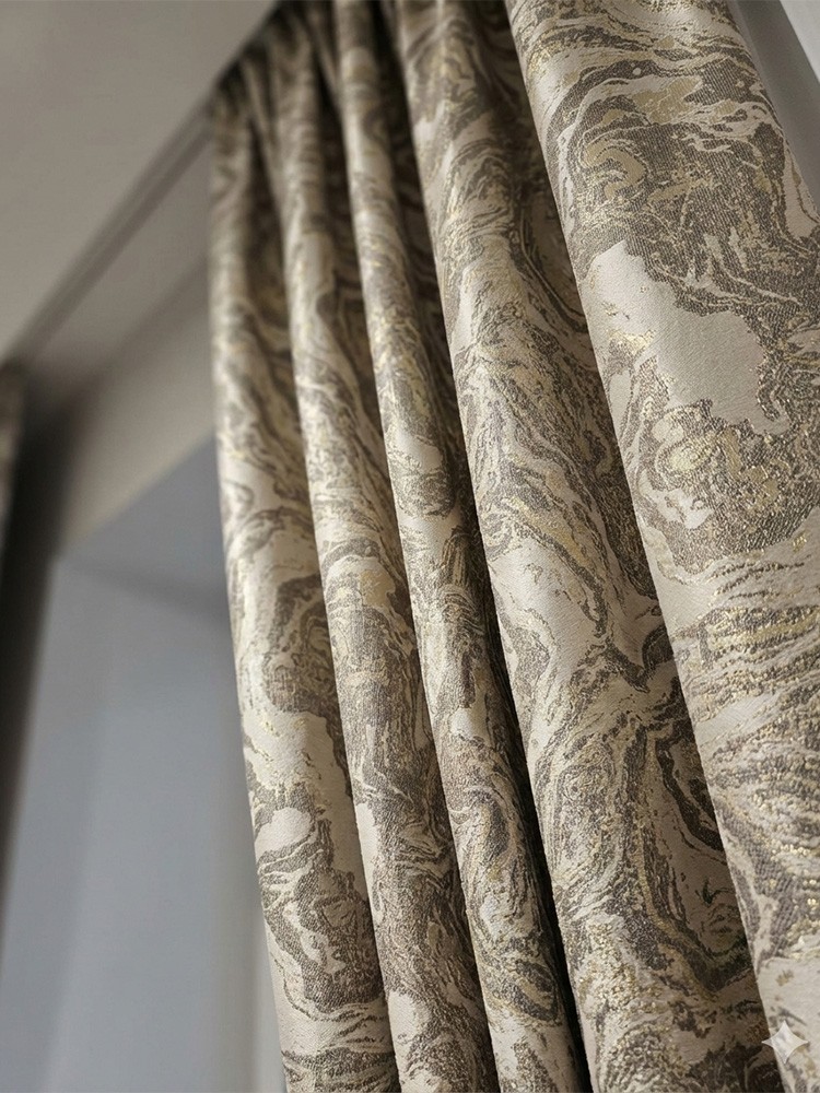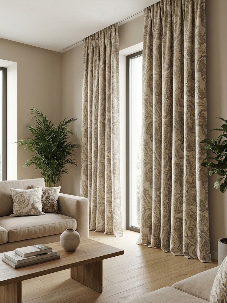 Тази завеса впечатлява с изразителна вълнообразна шарка, която напомня естествени движения и придава дълбочина на интериора. Светлия бежов нюанс заедно с шарки от капучино, оформя красиви гънки и придава завършен вид на пространството. Подходяща е за модерни дневни, спални или пространства с изчистен, стилен характер. Максимална височина на текстила - 290см. Състав - 100% полиестер.